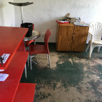 OFFICE CONTENTS TABLES, CABINET, ROUND TABLES X 2, PLASTIC CHAIRS X 6, STEEL SHELF